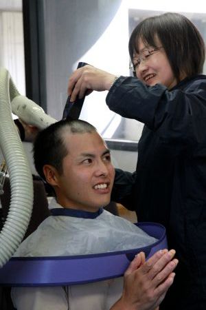 式の最中に丸坊主にしました